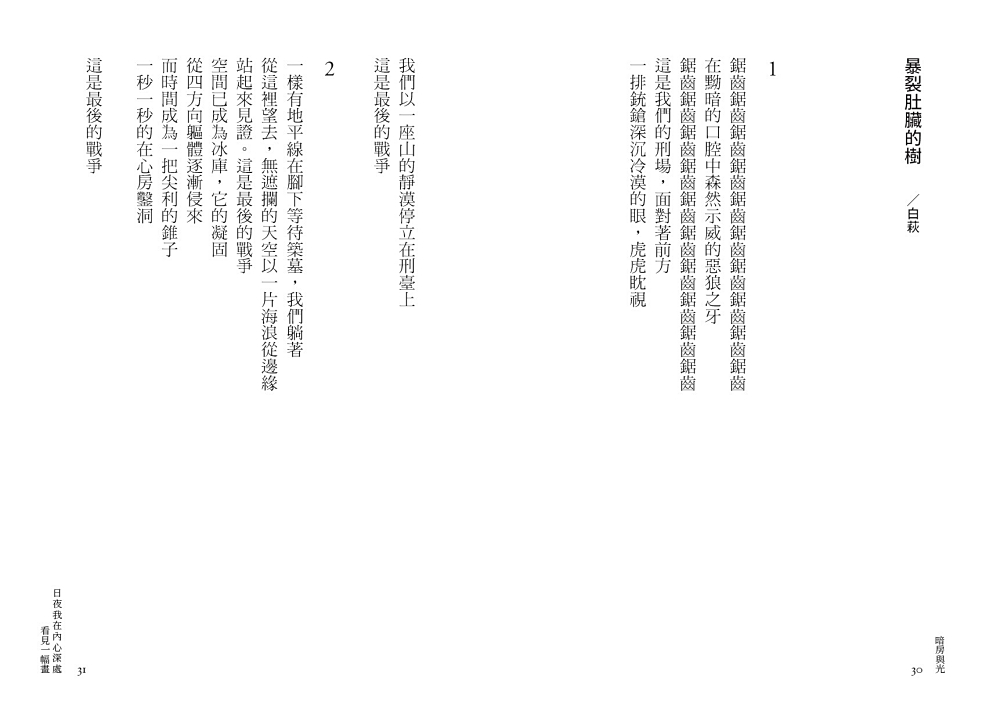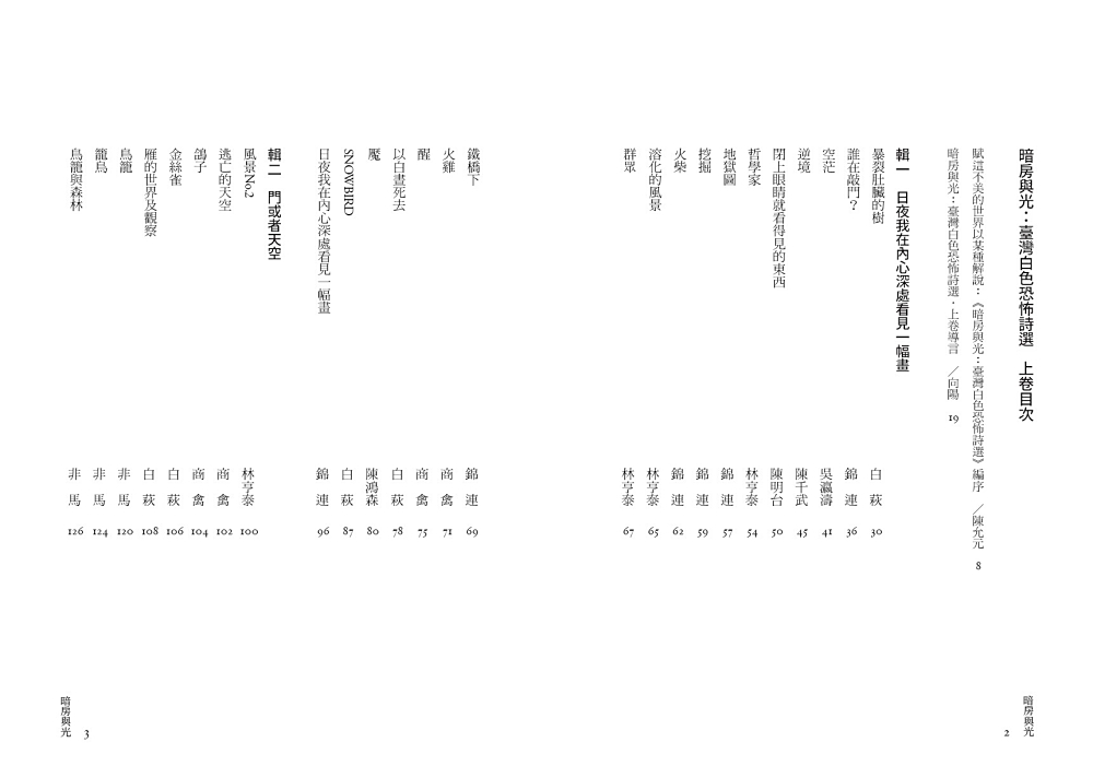 冬夜个面帕粄──記白色年代 /曾貴海|陌生人 /劉克襄|政治犯 /劉克襄|他 /劉克襄|二月 /陳黎|牆 /陳黎|盼望 /林雙不|葬花 /劉克襄|革命青年 /劉克襄|暗夜 /張芳慈|非 常態 /張芳慈|沉默 /楊淇竹|如果有人問起 /陳謙|夜雨 /蘇紹連|童年最後的野餐 /蘇紹連|狗尾草 /劉克襄|結束 /劉克襄|和平宣言──致楊建 /吳晟