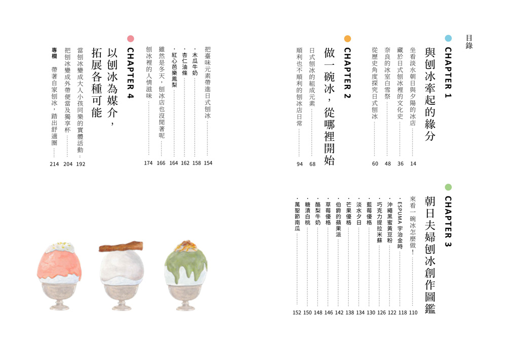 最後,看看日式刨冰的多變魅力,用不同形式體驗品嚐的樂趣,它可以是外帶便當,或是料滿滿的獨享杯,更是讓大人小孩開心交流的活動主題!趕快翻開本書,舀一口刨冰裡的有趣學問吧,每一頁都讓你暑氣全消!