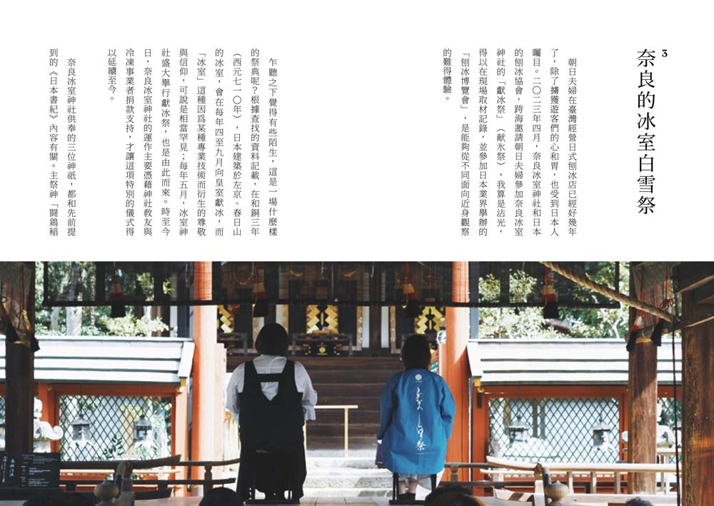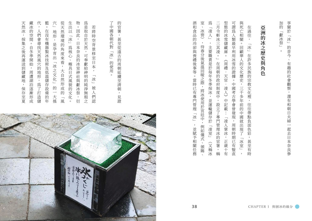 除了吃冰,書中還收錄了淡江大學大眾傳播學系助理教授──精采分享的冰之歷史,一樣不可錯過。臺灣、日本分別是從什麼時候始出現「冰」的?吃冰原本是貴族才有的高級娛樂?日式刨冰是如何走向世界、掀起現象級風潮的?除了梳理飲食歷史及文化脈絡之外,還要帶讀者走一遭在奈良知名的「冰室白雪祭」!