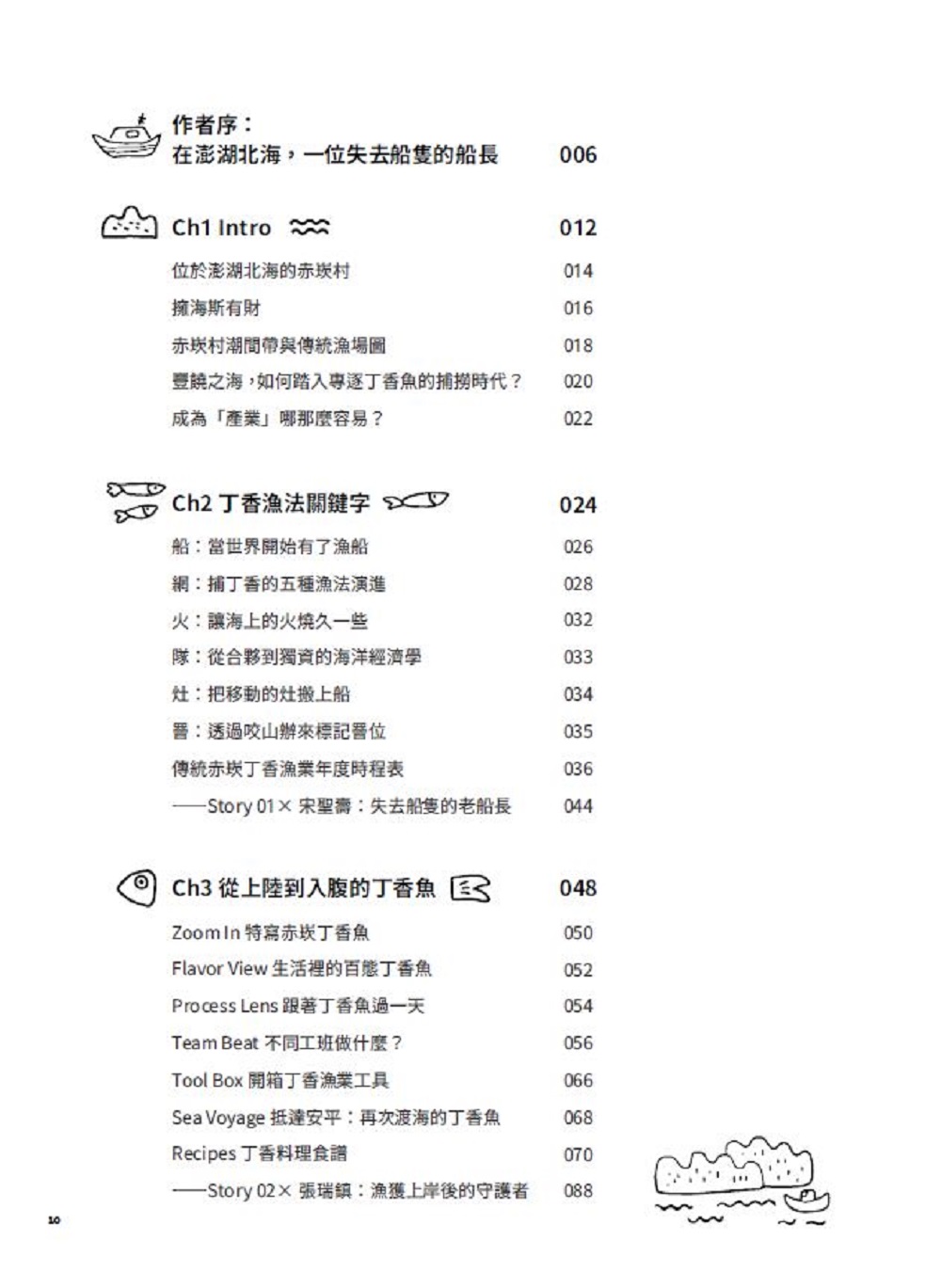 書中同時收錄四道丁香魚料理食譜與漁業影像圖輯。以台灣飲食中最日常的丁香魚為引,回望澎湖赤崁這片全台僅存的丁香漁業場域。從逐漸失落的捕撈技術,到漸次淡去的用海知識,這些文字與影像試圖喚回我們作為海民的記憶與身世,讓那片無門牌、無界碑,卻在漁人心頭清晰存在的「地方」,再次被看見。