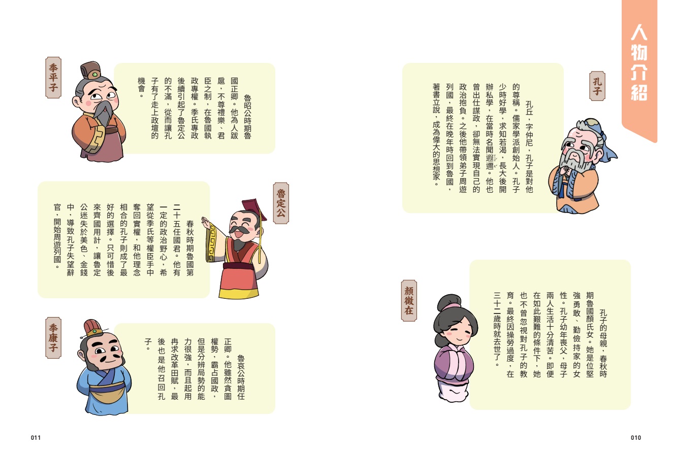 魯定公:春秋時期魯國第二十五任國君。他有一定的政治野心,希望從季氏等權臣手中奪回實權,和他理念相合的孔子則成了最好的選擇。只可惜後來齊國用計,讓魯定公迷失於美色、金錢中,導致孔子失望辭官,開始周遊列國。