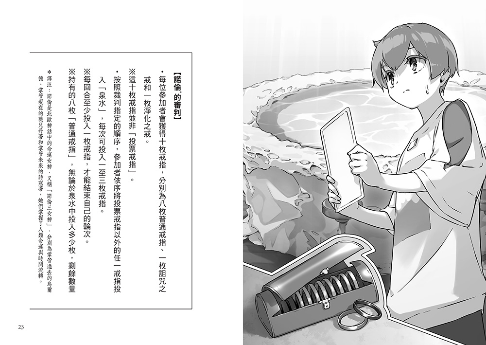 〔規則2〕按照裁判指定的順序,參加者依序將投票戒指以外的任一戒指投入泉水,每次可投入一至三枚戒指。