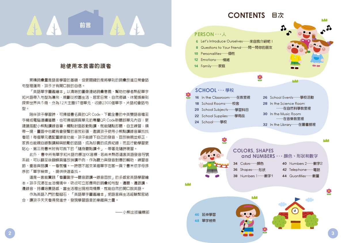 《第一冊:校園生活》——用英語介紹自己、個性與家庭、表達情緒、問候朋友;認識校園環境、教室、學用品、學科與活動,並掌握數字、數量、形狀與顏色等常用詞彙和句型;延伸學習更多與「家族」和「學習」相關的單字。