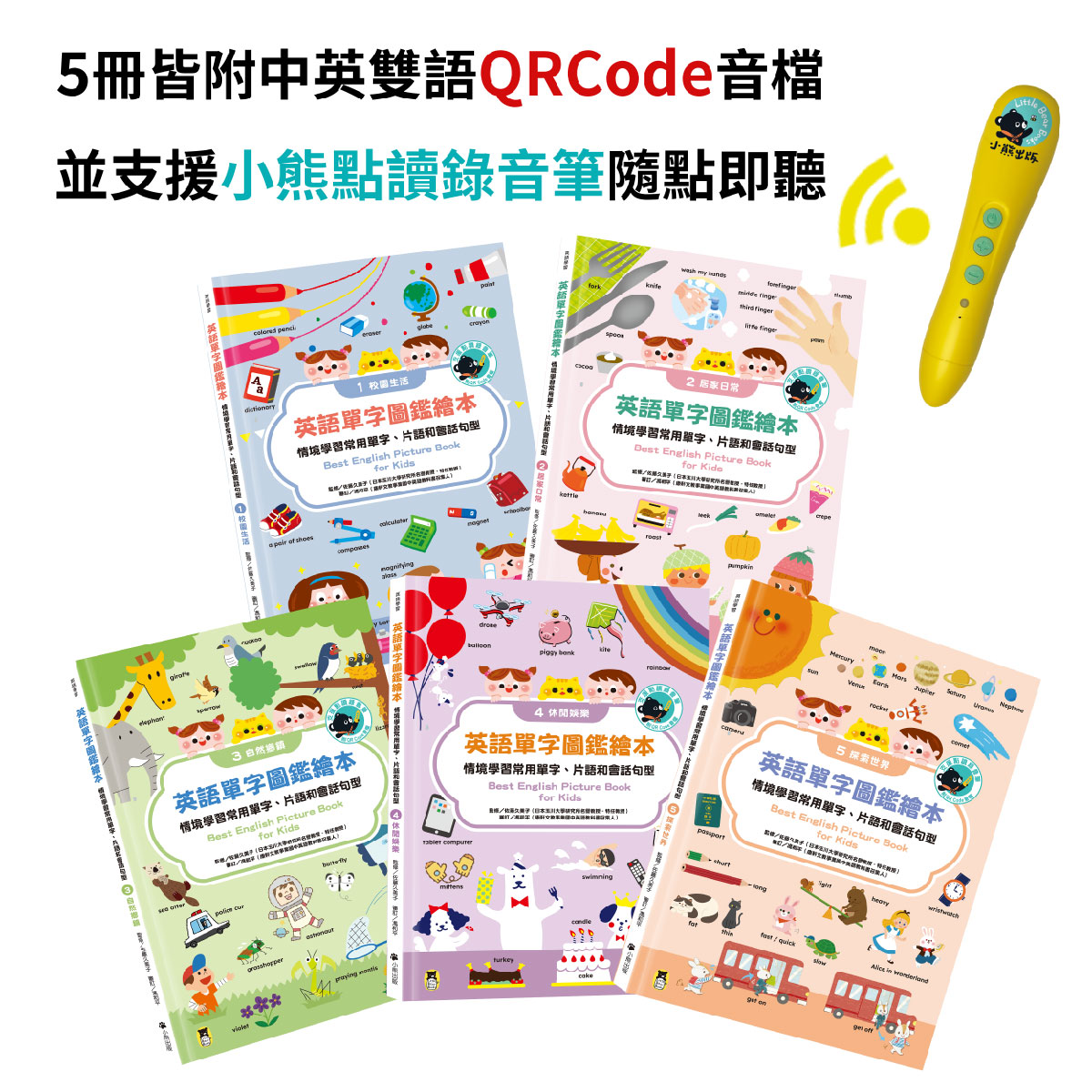 [小熊點讀系列]英語單字圖鑑繪本:情境學習常用單字、片語和會話句型Best English Picture Book for Kids,全套5冊,分冊目次如下: