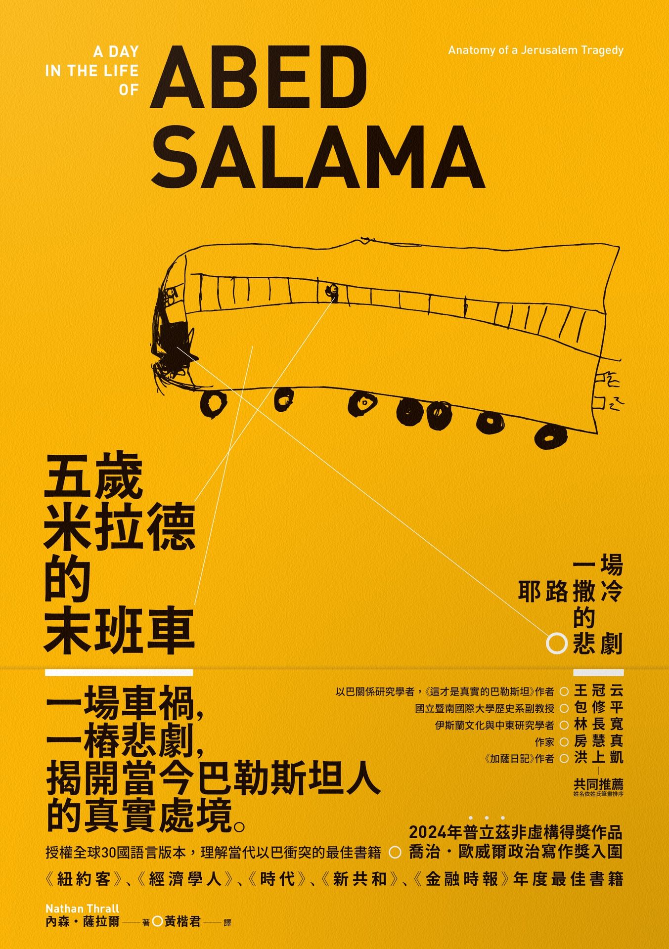 作者意識到這場看似偶然發生的交通事故,實質與整個巴勒斯坦民族的當下處境緊密相連。他一步步追尋這些各自有著不同背景和種族人士,進行了大量調查與訪談,梳理出意外背後錯綜複雜的種族、政治與歷史因素,同時以受害者之一的阿比德與米拉德父子為主軸,揭開多段交織著生命、愛情、家族和歷史的私密故事,為以巴之間無休止的爭鬥提供了一幅不限於種族敘事的人性卷軸,幫助我們理解這個目前戰況激烈之地人民的真實境況。