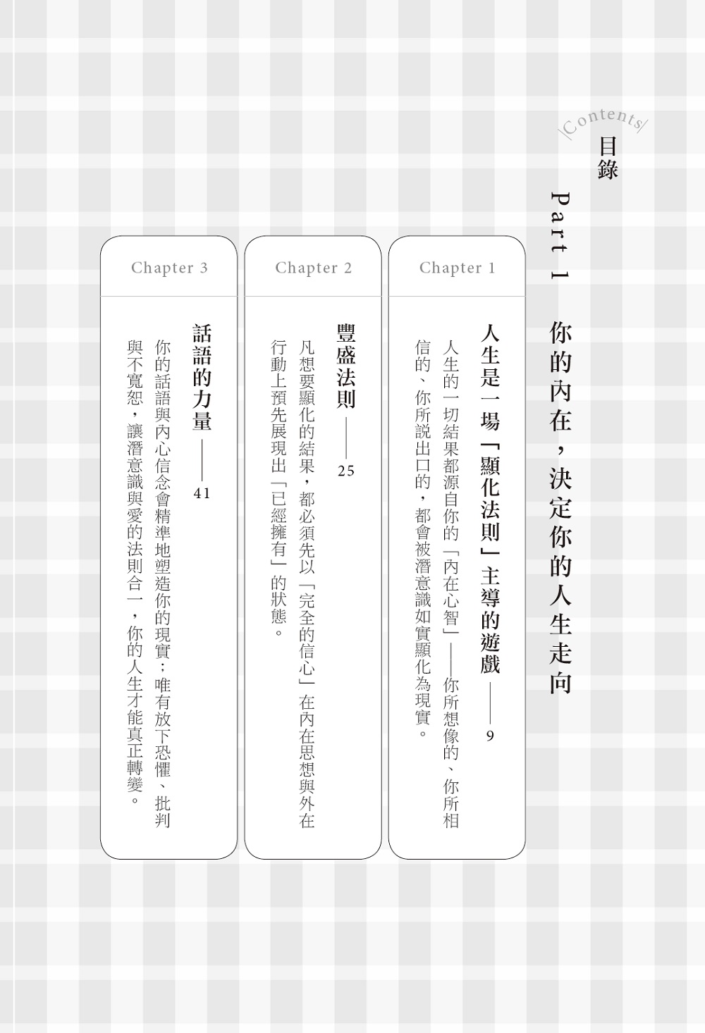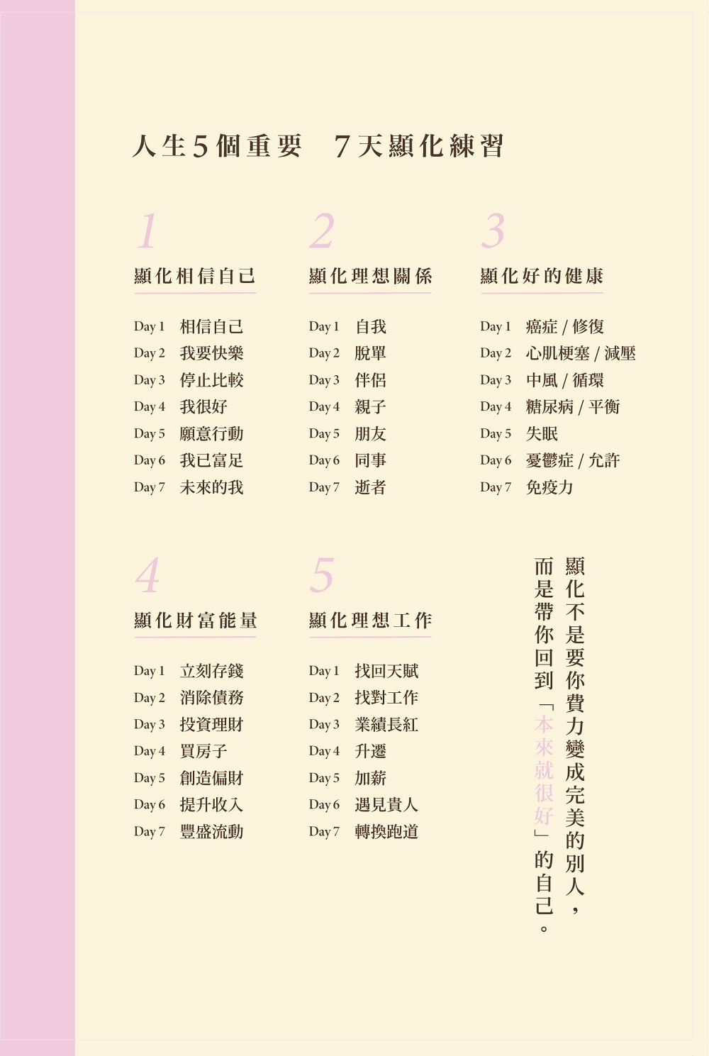 每天只需幾分鐘,透過願景、肯定語、顯化行動、感恩重塑內在。