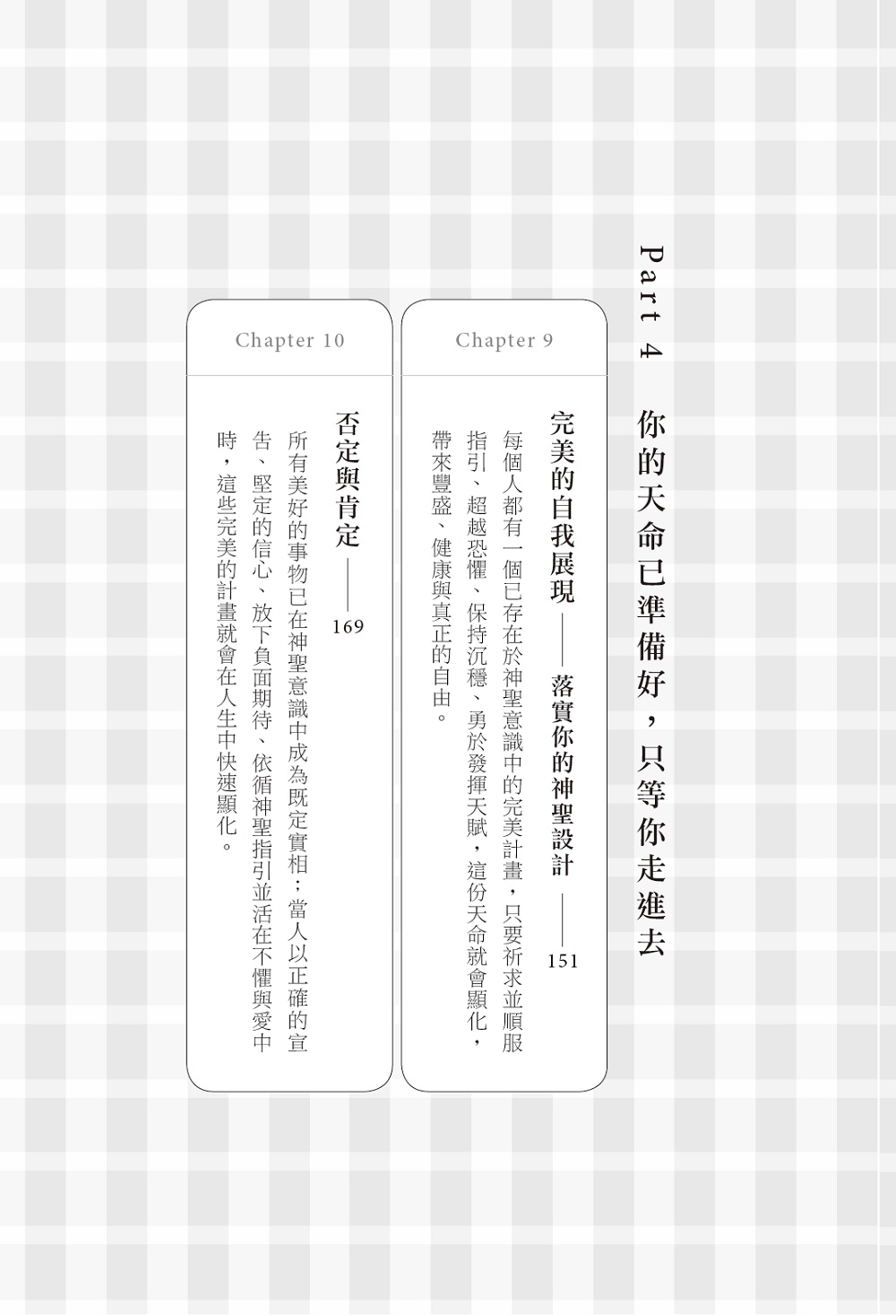 每個人都有一個已存在於神聖意識中的完美計畫,只要祈求並順服指引、超越恐懼、保持沉穩、勇於發揮天賦,這份天命就會顯化,帶來豐盛、健康與真正的自由。