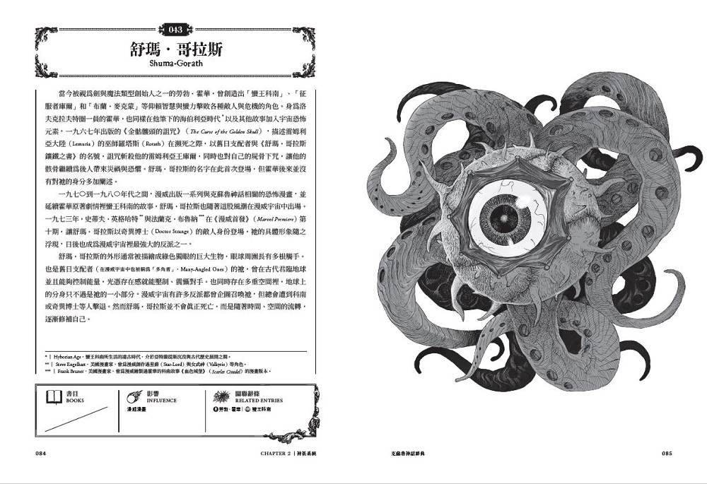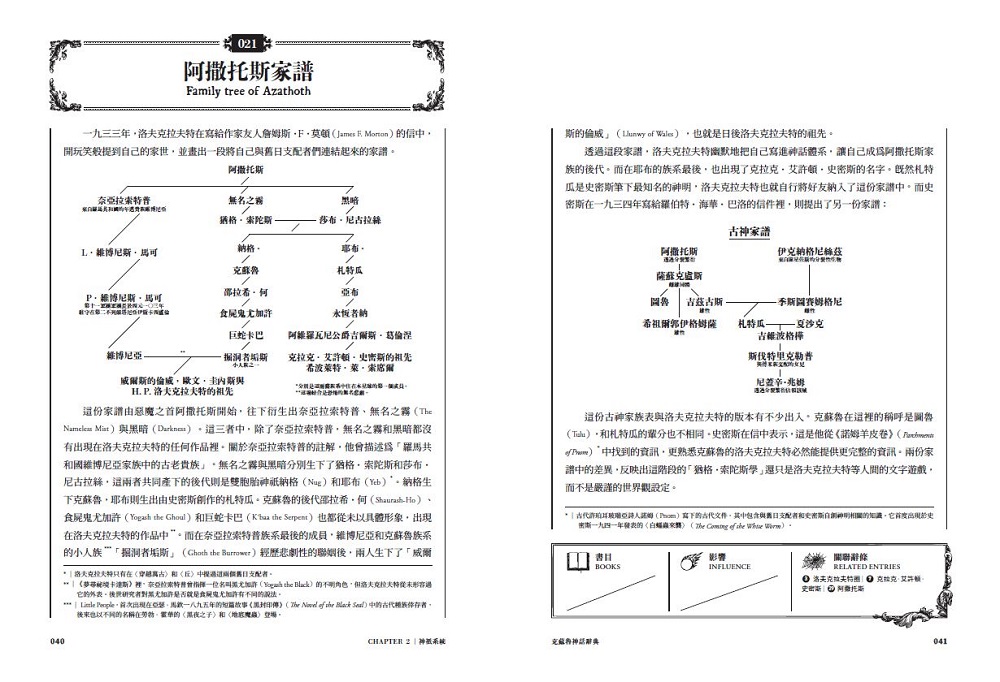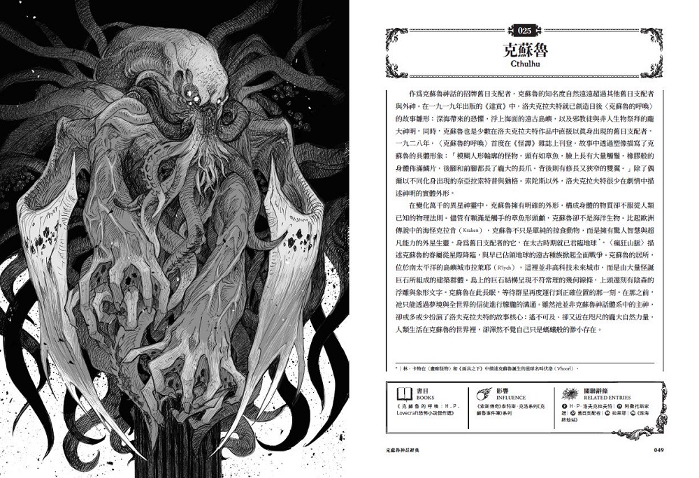 ⬯ 全書涵蓋神祇、外神、幻夢境、禁書魔典、異域生物、重要人物地點等條目,並設置「關聯辭條」以建立知識網絡。無論是研究者、創作者,或是單純熱愛恐怖美學的讀者,都能在此獲得完整的參考與靈感。