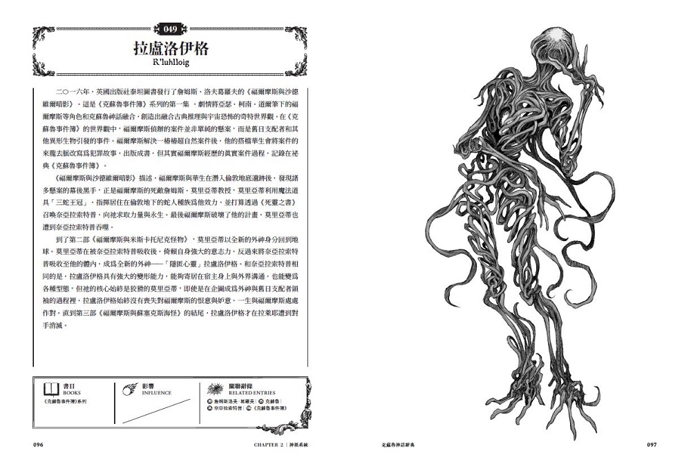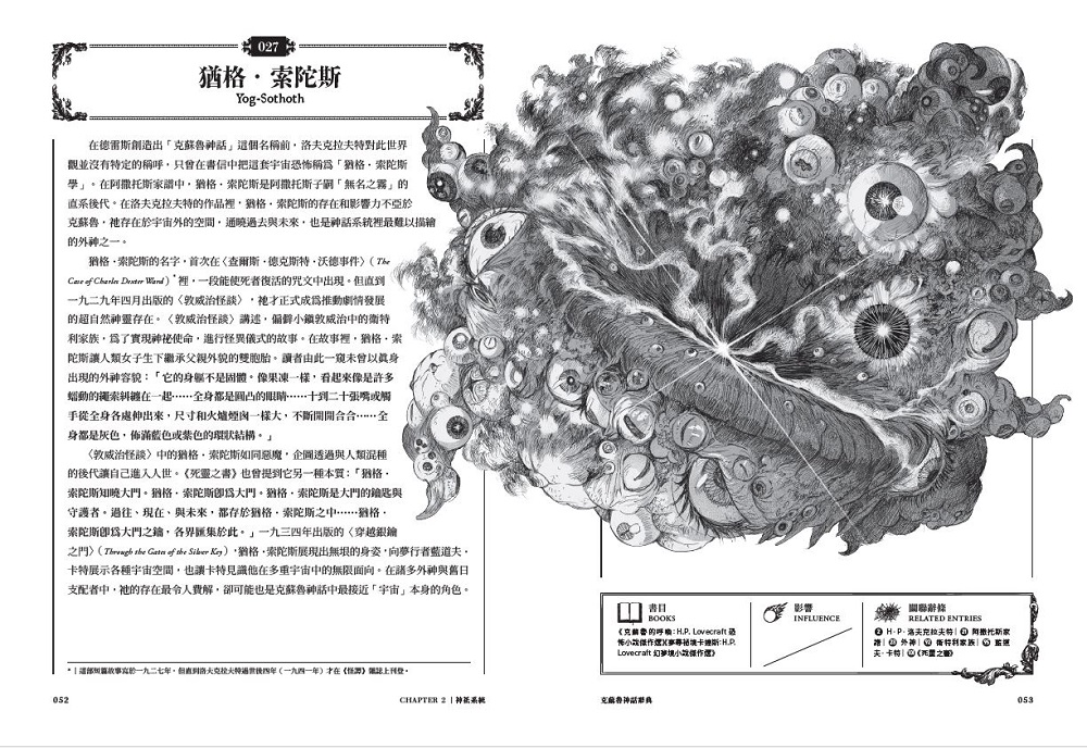 ⬯ 全書涵蓋神祇、外神、幻夢境、禁書魔典、異域生物、重要人物地點等條目,並設置「關聯辭條」以建立知識網絡。無論是研究者、創作者,或是單純熱愛恐怖美學的讀者,都能在此獲得完整的參考與靈感。