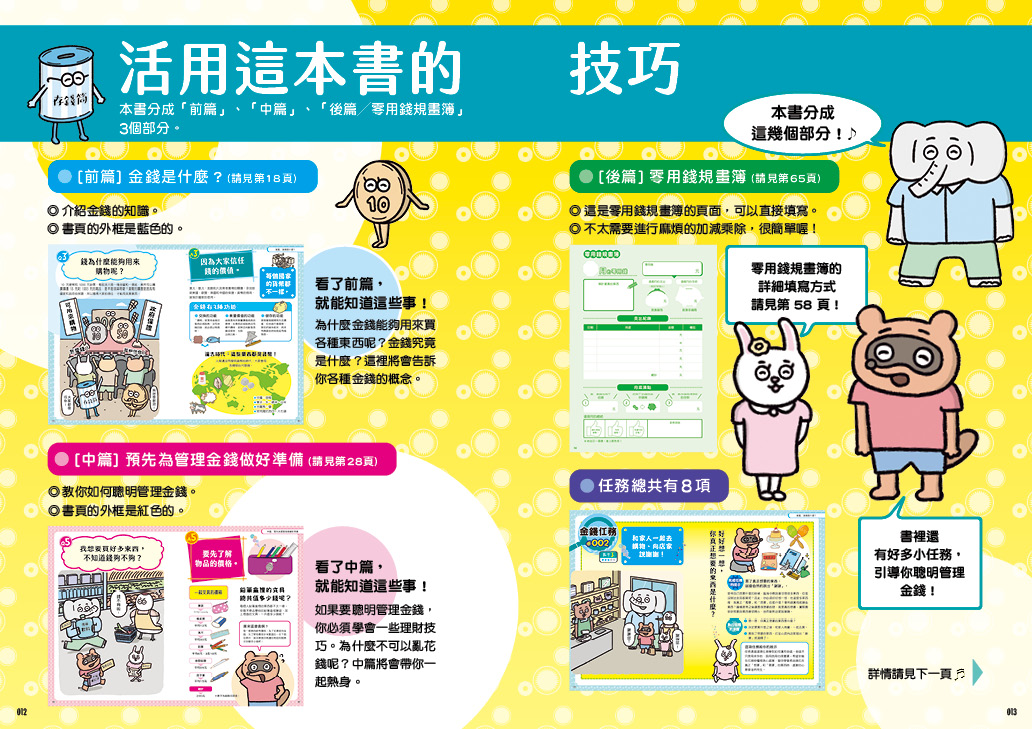 本書分成「前篇」、「中篇」、「後篇╱零用錢規畫簿」3個部分,先透過「前篇」理解金錢的概念,再藉由「中篇」學習理財技巧,最後使用「後篇」的零用錢規畫簿來實際執行。