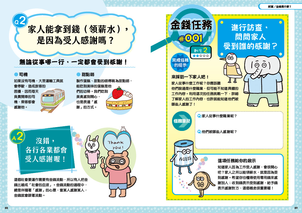 除了帶孩子以有趣、生活化的方式探討金錢問題,更搭配「8項金錢任務」引導孩子透過實際行動探索金錢的世界,譬如訪問家人的工作內容、調查物價、實際比較超商/超市定價異同及分析背後原因、尋找綠色標章商品等等。實作8項金錢任務,孩子將理解金錢運作的整體樣貌,並培養出對周遭環境及金錢波動的敏銳觀察力。