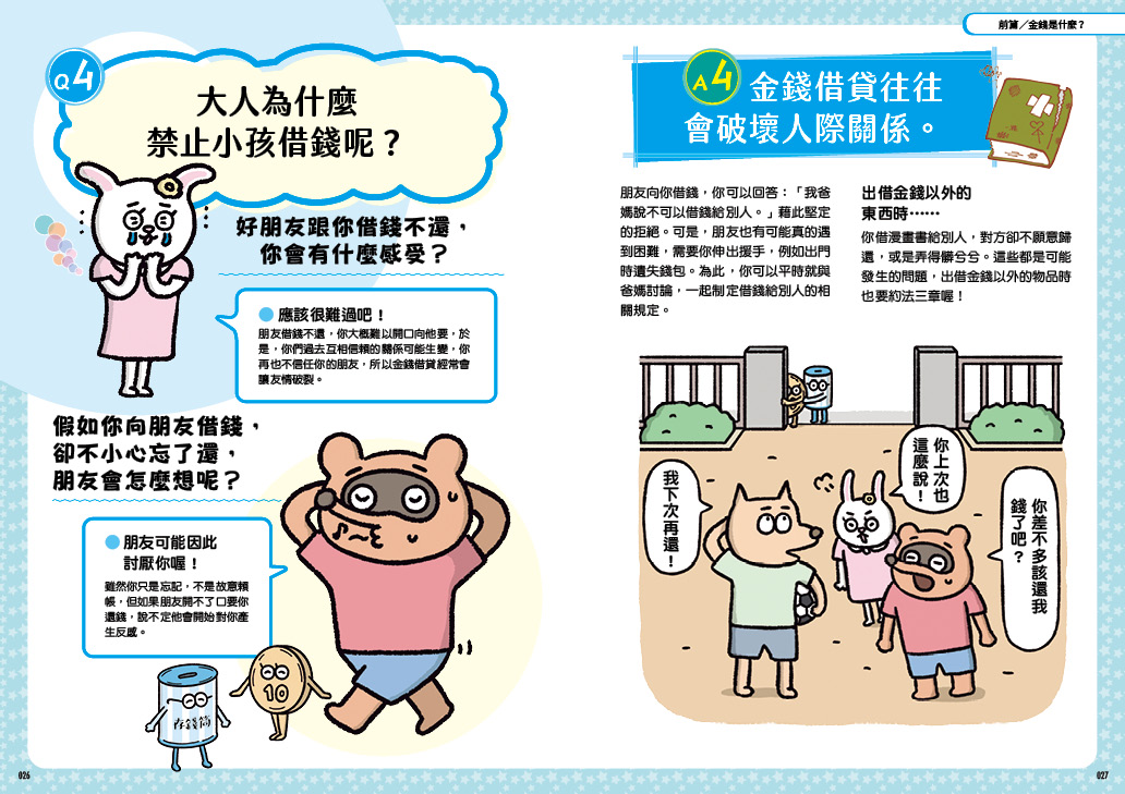 此外,書中還穿插漫畫篇幅,包括「金錢的歷史」講解人類文明如何從以物易物到以貝殼、金屬為貨幣,進而發展出紙幣與銀行;以及「生活故事案例」呈現不會理財所遇到的真實困境。