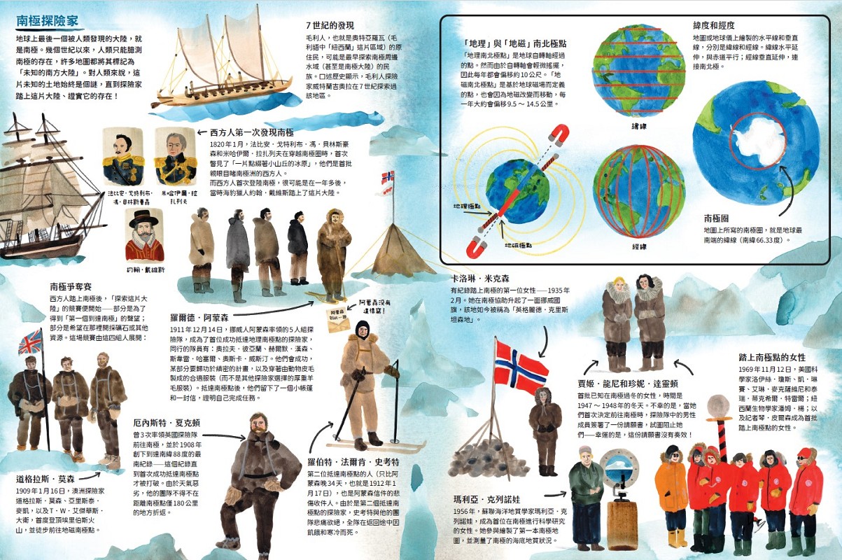 從巨大的大王酸漿魷和活火山,到研究船和板球比賽,南極不只有企鵝和冰山(當然,那裡確實有很多企鵝和冰山啦)。了解人類如何在地球上最寒冷、最乾燥、風最大的地方生存,所有你知道、你不知道的南極知識,全都在這本精采繪本中為你揭曉。