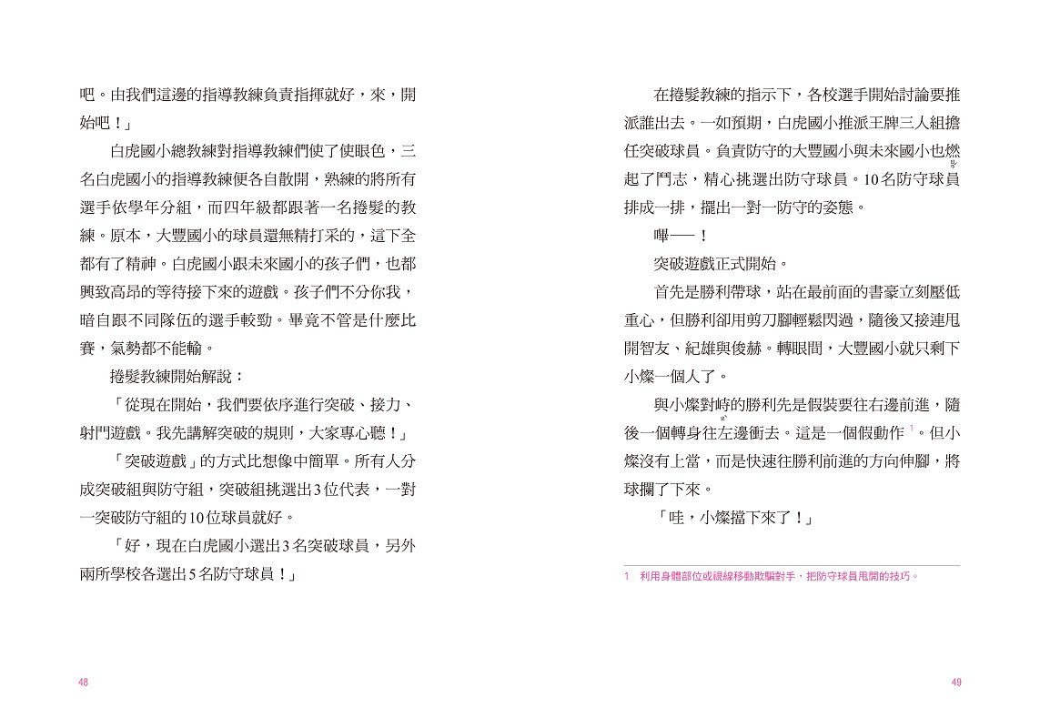 娜燕隨口接了一句話,孩子們趕緊仔細查看手上的簡介。除了大豐國小之外,其他兩所學校的選手大約都有50人左右,而且都有3名教練,白虎國小甚至還有經紀人呢!又不是什麼藝人!僅僅只有10人的大豐國小,在練習的時候只能夾在兩隊之間,有種小蝦米對抗大鯨魚的感覺。一想到這裡,孩子們有些沮喪。