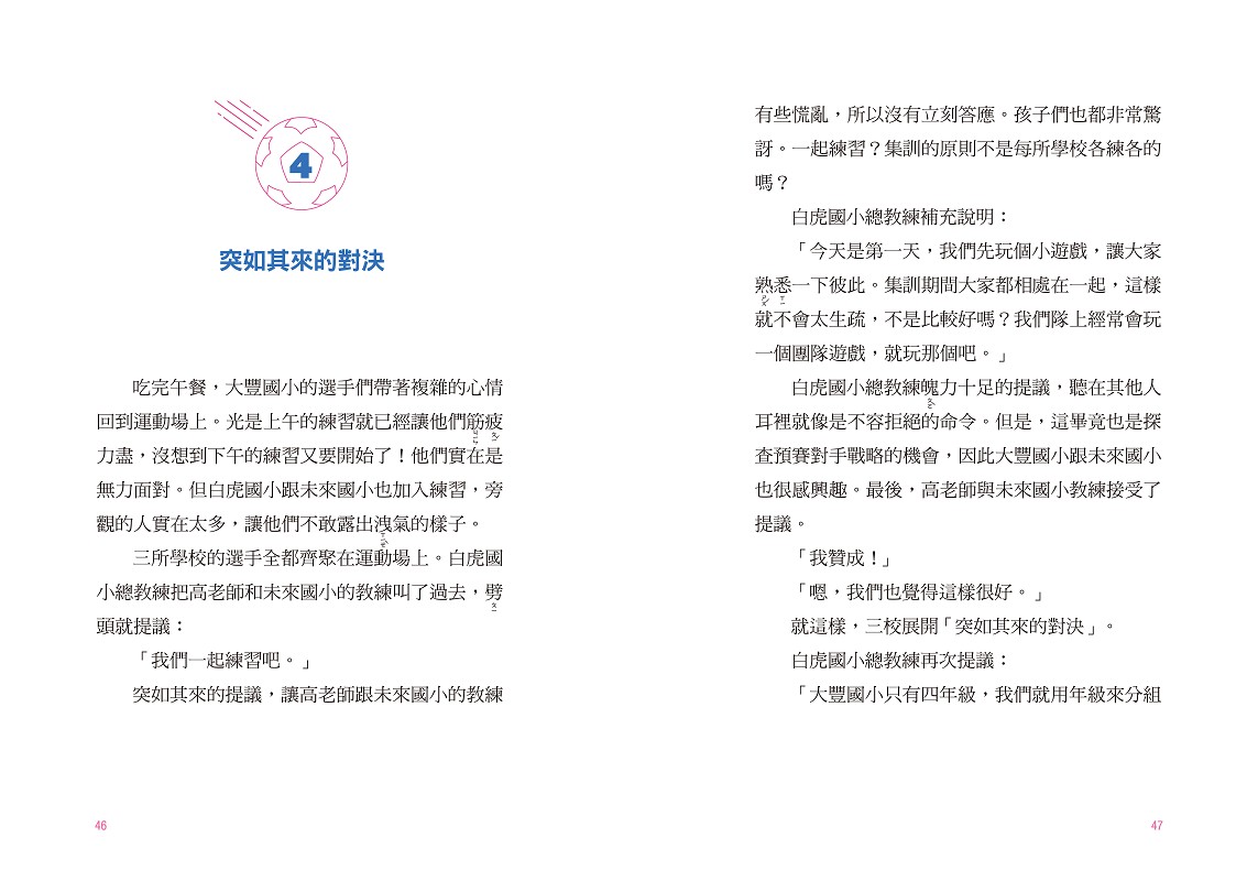 孩子們捏了捏自己的臉頰,興奮的討論著。其實在茶山島舉辦的聯合集訓,可是全國各地青少年足球隊爭相參加的計畫,競爭非常激烈。即使是茂江市,每年也只有白虎國小固定參與。不擅長察言觀色的高老師不知用了什麼方法,竟然在沒有教練的幫助之下,成功讓大豐國小參加這次的聯合集訓。
