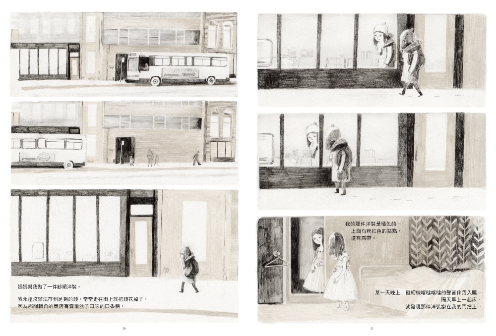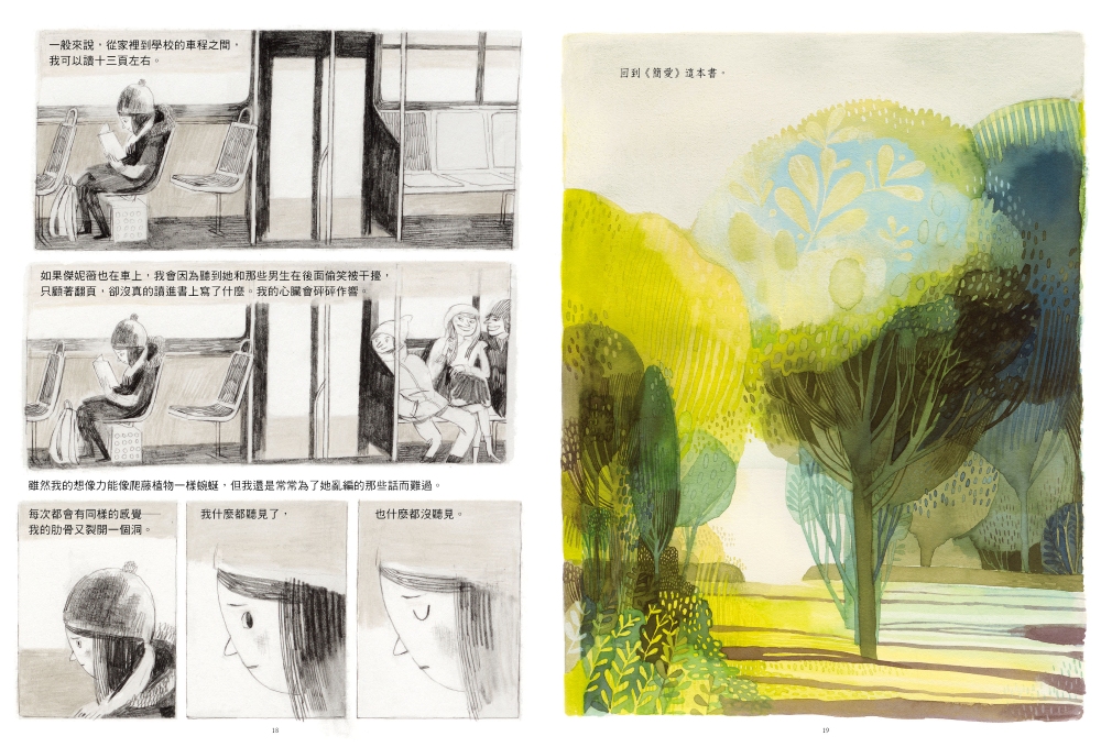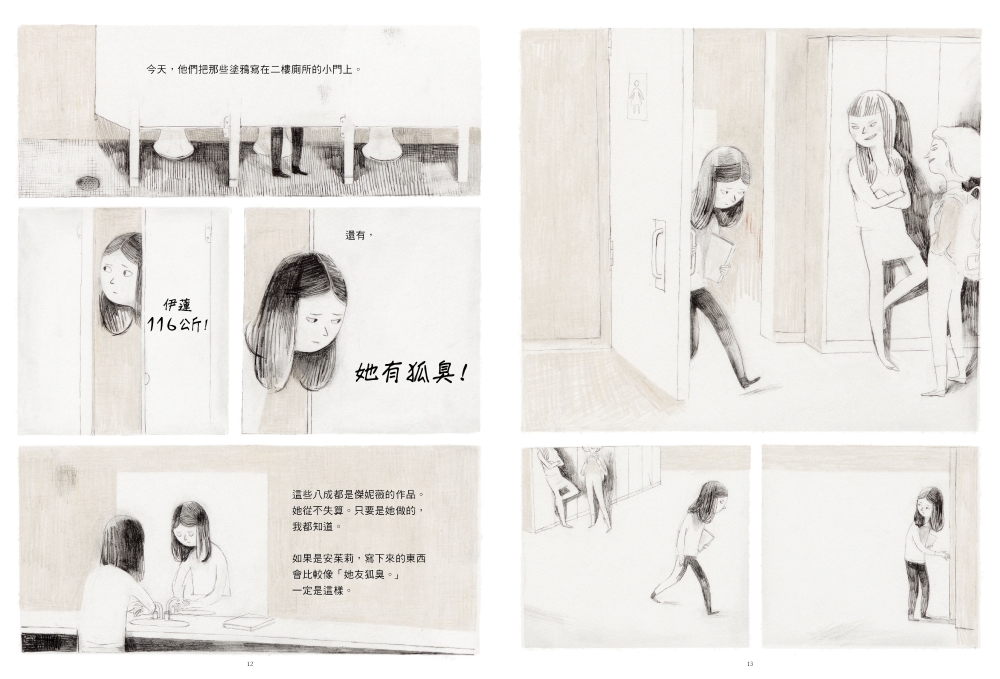 《簡愛,狐狸與我》述說少女依蓮的日常生活,在學校裡遭到同學的欺負,不只是言語霸凌,還直接在廁所亂寫她的壞話。依蓮或許決定不理睬那些曾經要好,現在卻形同陌路的女孩們,但她還是受到了傷害,介意自己被邊緣化、被孤立的處境。而一頭栽進《簡愛》的故事裡,或許拯救了她。故事一開頭,依蓮令人感同身受的內心獨白,畫家生動且精細描繪出女孩畏縮的樣貌和表情,整個學校都很陌生,甚至連整條街上、公車上都沒有溫度,死板而灰暗……讓讀者回想起那樣青澀而面臨日常生活卻不知所措的青春時光。