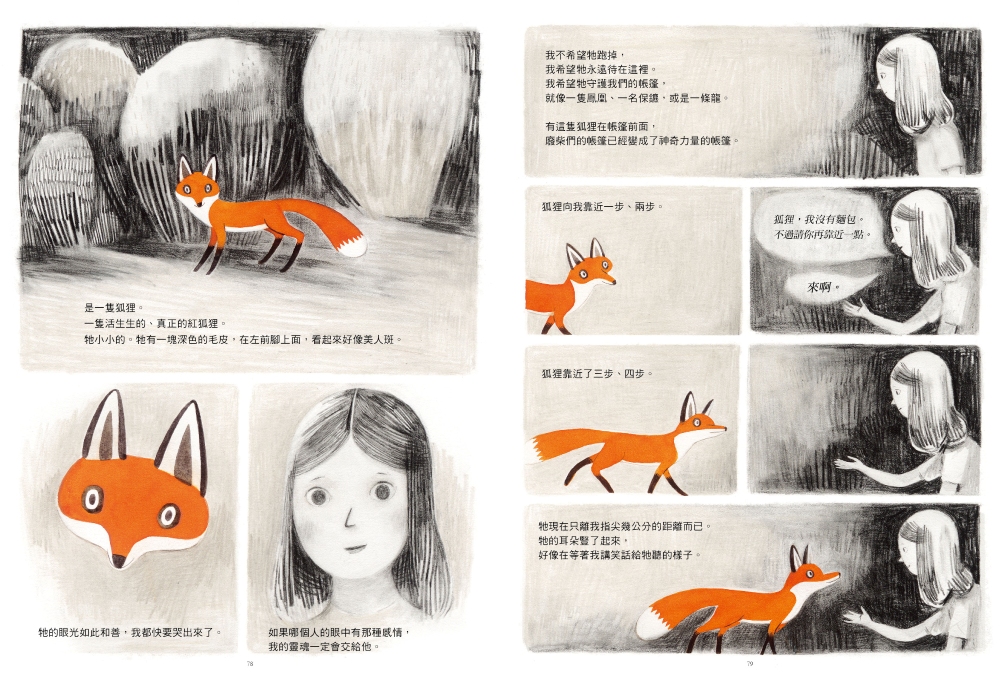 《簡愛,狐狸與我》喚起我的一段學生時期記憶,有點灰暗卻很動人,因為是那麼的真實具體,每個角色都能輕易的對號入座。灰階畫面像一部格放電影,無聲的,更能專注觀賞;看似隨興的筆觸卻是精心的佈局,它是詮釋孤獨意境之中最美的繪本。——南君(插畫家及藝術家)