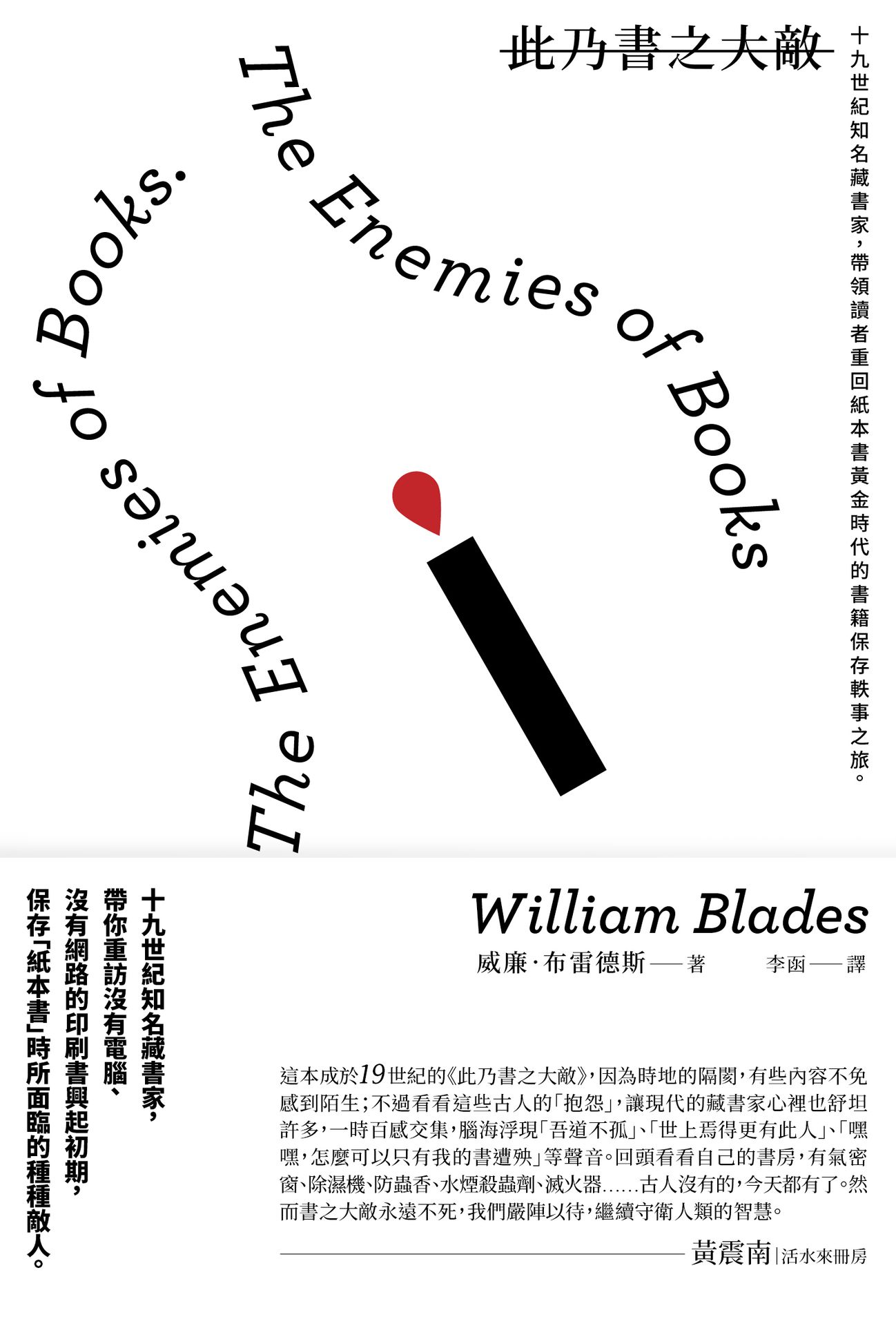 身為19世紀知名藏書家、印刷商,以及英國第一位書目學家,作者以自身收藏書籍的經驗,詳細分析了各類稿件與書本的保存方式。除了舉出眾多古代藏書所遇到的問題,他也提出不少因人為疏忽所造成的書籍損害範例。