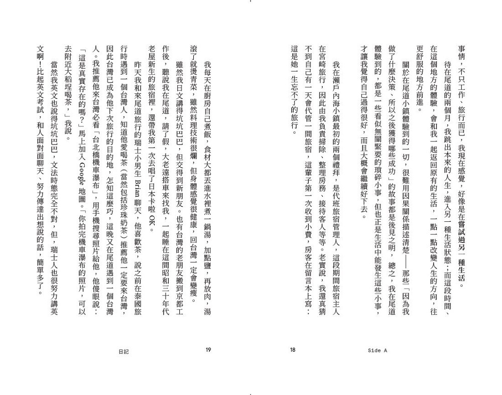 「有時我會覺得,尾道的日子是不是一場夢?那真的發生過嗎,不是腦海裡的幻影嗎?但只要我再次走出車站北口,石階爬得大腿酸痛、喉嚨喘得好乾澀,從山徑轉彎之後,看見那棟紅屋瓦黃牆壁的屋子,那空氣裡的氣味,遠方寺院傳來的鐘聲,都告訴我,尾道確實存在於這世界,而我隨時都可以回來。這裡,有製作戒指的人、眷戀舊物所以持續修理的人、論文寫不出來的人、跨越半個地球移居而來的人、在電影院為默片彈鋼琴配樂的人、因為喜歡那家店的氛圍而去打工的人;還有偶爾會煮失敗的阿媽一人經營的喫茶店、吃完飯可以上樓睡午覺再下來喝咖啡的小餐廳、從深夜營業到凌晨的古書店,當然還有,每天能遇見不同生活的可愛旅宿。