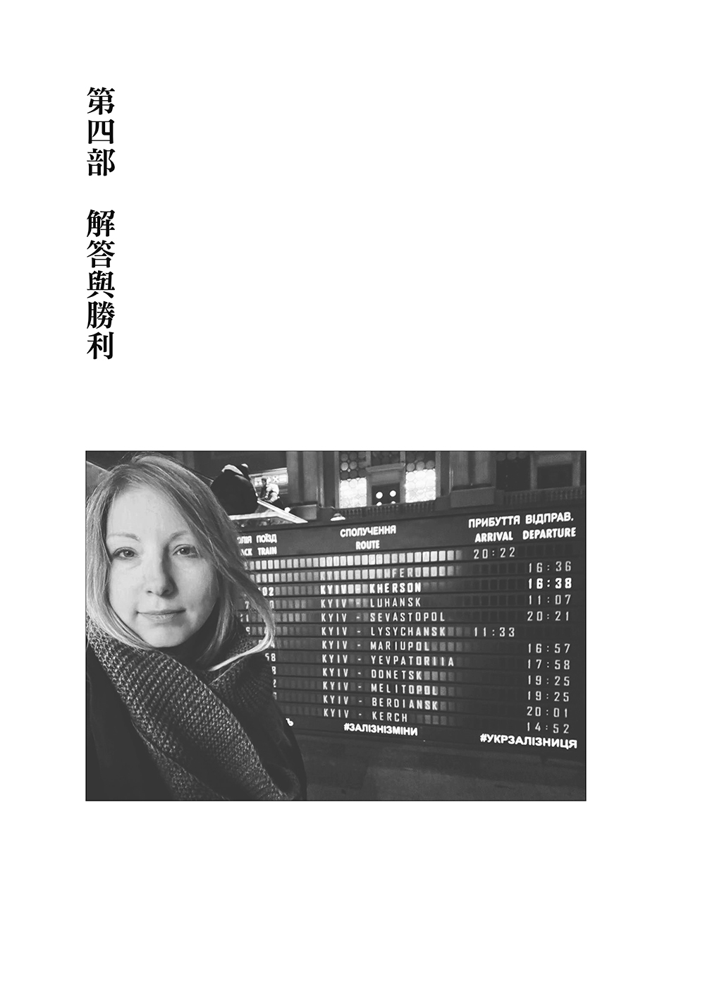 我想我能,而且我會。我急忙看向藍色螢幕上的起飛時間。這將暫時是我最後一次於這樣的螢幕上看到烏克蘭的城市:利沃夫、基輔、哈爾基夫。我會在每座機場的藍螢幕上尋找,希望這場噩夢終將結束。