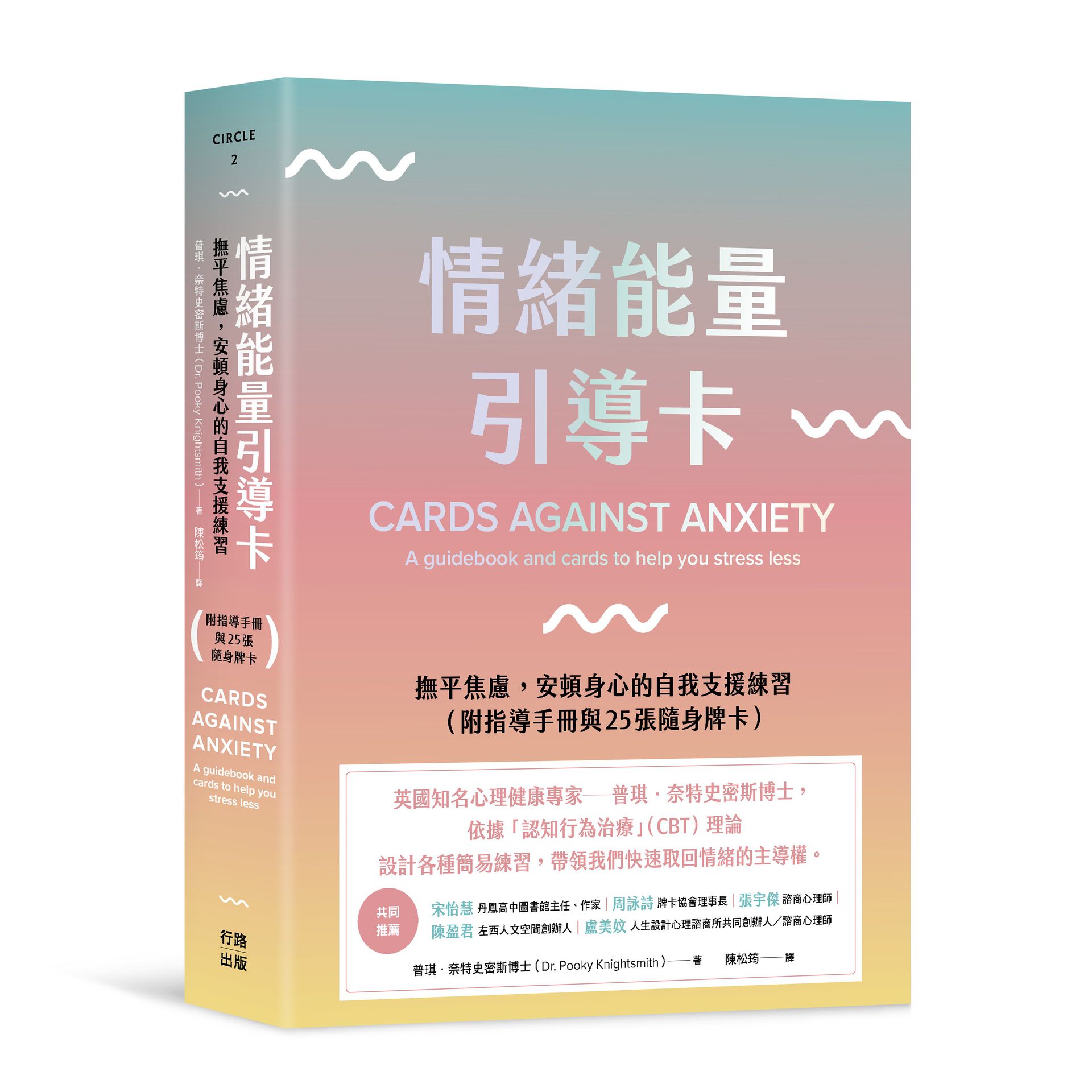 來自英國、擅長處理兒童和青少年心理健康議題的知名心理及精神疾病專家──普琪.奈特史密斯博士,針對現代人在生活中經常面臨的焦慮與壓力問題,以認知行為治療(CBT)理論為基礎,設計出《情緒能量引導卡》指導手冊與隨身牌卡,帶領讀者對抗或預防焦慮等情緒,這些方法包括: