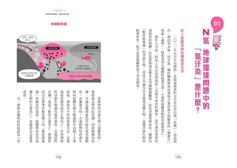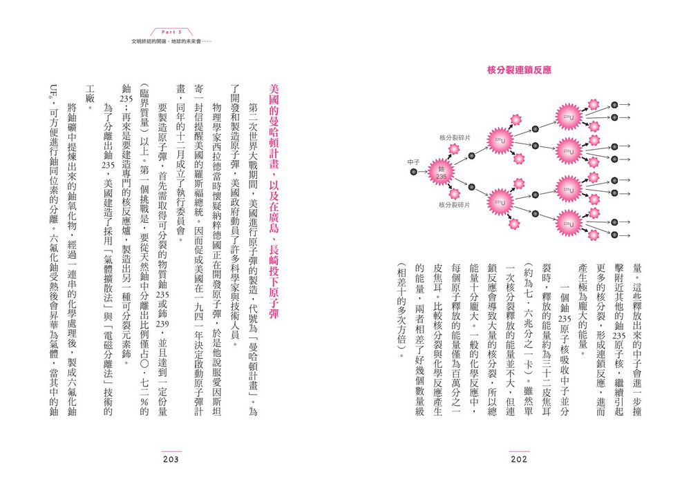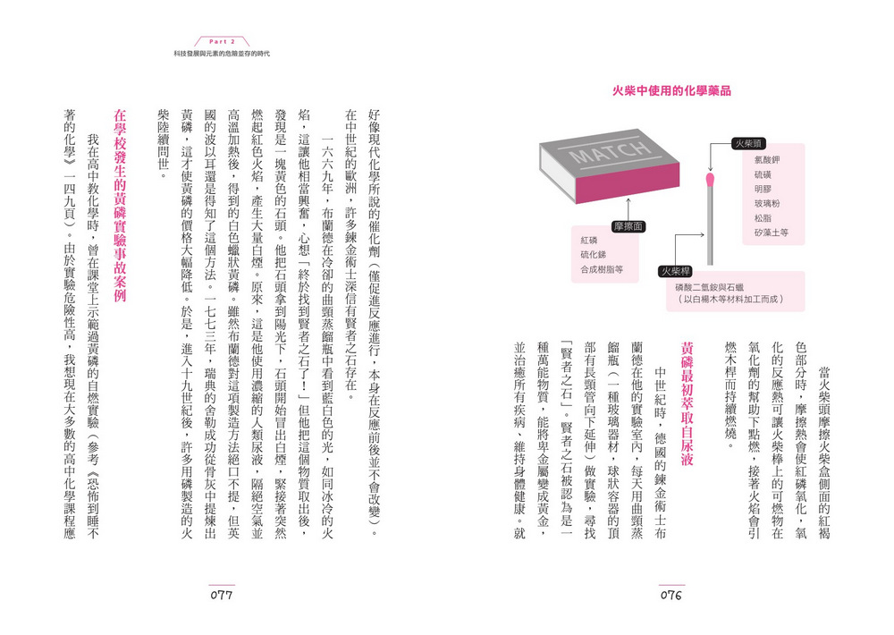 什麼是恐怖的元素呢?本書介紹了「有毒的元素、致命的元素、會爆炸的元素、破壞環境的元素」等等。在過去,工廠排放的有毒氣體與廢水,曾使人罹患了哮喘、水俁病、痛痛病等可怕的疾病。一九六〇年代的日本,甚至有「公害列島」之稱,全球各地的公害研究者都紛紛去到日本親眼見證環境汙染的後果。由於這些情況,後來日本也開發出許多清除汙染源的技術。除此之外,書中也會探討「稀缺的元素資源」對於工業發展乃至於地緣政治的影響。
