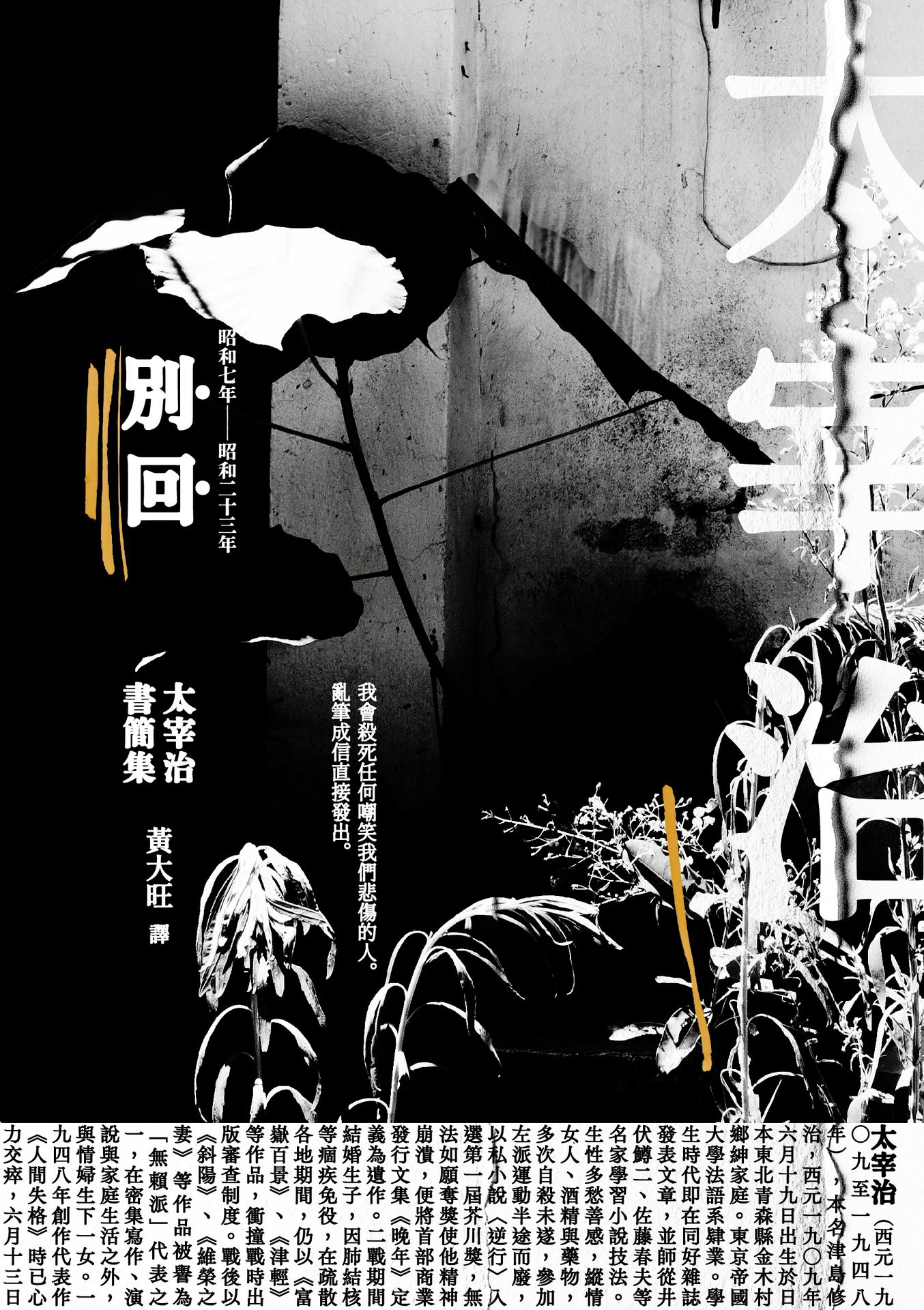 瞭解太宰──溫柔、煦暖,又悲觀、脆弱的太宰。一封封寫就寄出的信帖,見其在困頓生活與健康長久堪慮的折磨下,展現溫存於創作世界裡卑微的自由,同時擁抱世界的一片漆黑與文學之光。太宰治性格起伏,度日束縛,書信裡被縱觀透徹,從首部作《晚年》至卒年寫就的《人間失格》,其間忙裡忙外的庸碌;此集彷若敲碎文學家的華美鏡表,一覽既深且廣又百般為難的日常:身為作家對出版社的庶務,身而為人對家庭與人際關係的俗事……人的一體多面在個別對象的去信中盡顯無疑,對恩師、文友、親人或祕戀,他一貫用字懇切坦白、愛恨確鑿,信中更多是與生活纏鬥,心煩其財務、病症、崇高的文學意念與當下文壇的格格不入,更甚者為埋藏光陰暗層的巨量愁緒。太宰治對文學本質的深度索求,成為內燃自毀的根源,每一書信都像隱喻各異的求援,無聲、無明,甚又暗藏不願被理解的情緒矛盾。