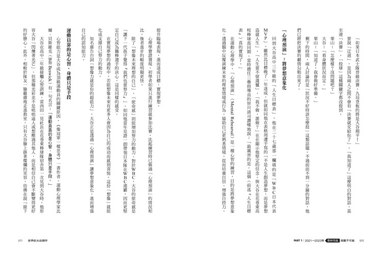 本書完整呈現大谷翔平2021-2025年的全盛時期,場上的封神戰役以及場外的名言軼事,深入探討「世界的大谷翔平」背後,各種不為人知的夢想實現力、一流思考法與目標達成術,闡述剖析大谷翔平將夢想具象化、戰勝不可能的「大谷流思考」。