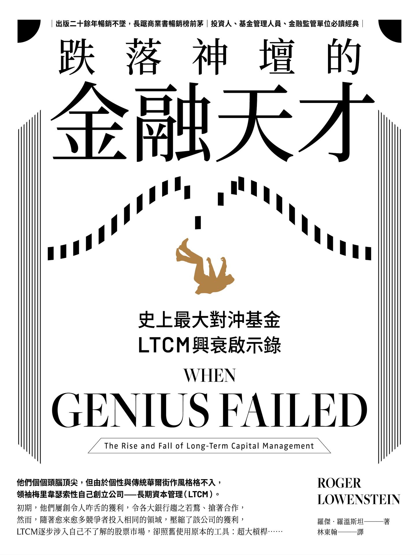 本書中,作者根據LTCM的內部機密備忘錄,採訪了數十名關鍵當事人,以及參與拯救該公司的重要銀行代表人員,用扣人心弦的細節,以淺顯易懂的寫法,描寫了長期資本管理公司跌宕起伏的興衰過程。從中我們得以清楚了解:LTCM的內部運作方式;個別合夥人的個性差異與影響;投資股票、債券和衍生性金融商品的主要差別;有效市場假說的謬誤;電腦對金融交易的影響;以及讓這一切成為可能的1990年代末華爾街文化。種種細膩的敘述,使得金融史上這起知名事件,讀來猶如一部扣人心弦的驚悚片。(各章內容簡介請見目錄引文)