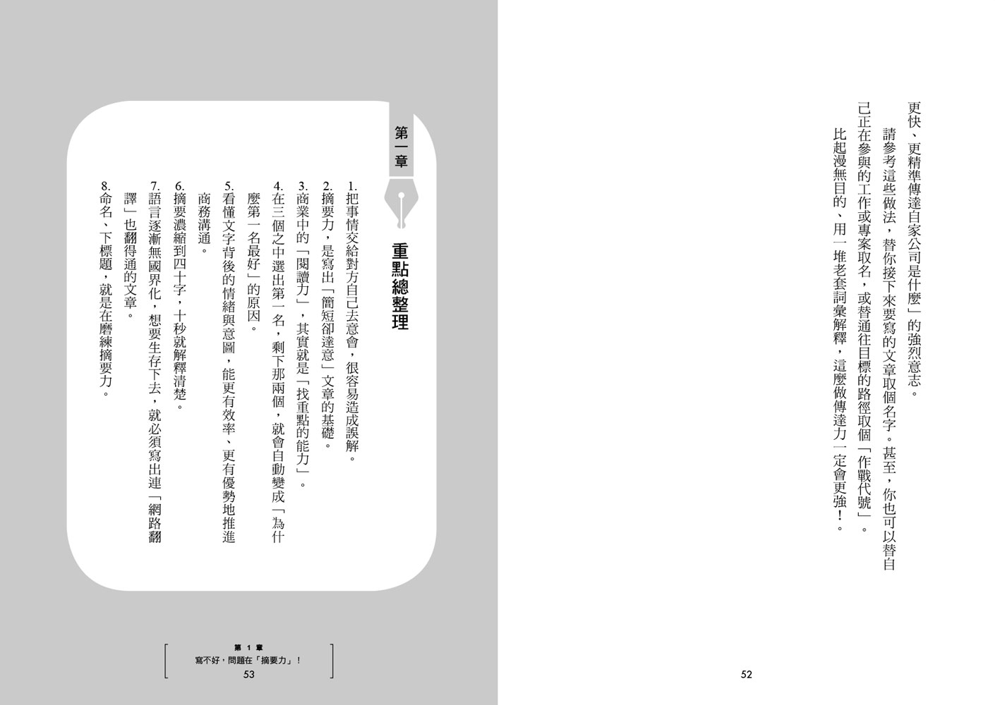 本書第一章會介紹一套基本方法:如何從書籍、資料、會議內容等資訊中找出「重點」,並整理成摘要文。