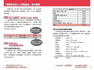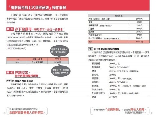 本手冊內容分為兩大部分:「養肥荷包的七大理財祕訣」實行範例+「10%薪水致富術」實際操作表格。