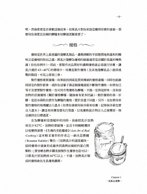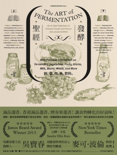 書籍專頁:發酵聖經:奶、蛋、肉、魚、飲料 我們的任務不在複製全球最熱門的發酵品, 而在承接先人利用周遭資源發展發酵的智慧。 素食發酵隨手可做,葷食發酵風味變化無窮。 運用手邊現有資源,當地當季盛產什麼就做什麼,最簡單也最能體現發酵的原初精神! 奶類發酵:克菲爾 乳糖不耐症者,除了優格還可以喝什麼?在裝有乳汁的玻璃罐中加入克菲爾顆粒,每1公升乳汁加入1大匙,密封玻璃罐後,置於屋內陰涼處進行發酵,並且定期搖晃或攪拌。當你看到液體變得濃稠,就代表克菲爾完成了! 魚類發酵:醃漬鮭魚 斯堪地那維亞鼎鼎大名的特產,在家廚房也能出現。只要用鹽、糖、蒔蘿以及其他香料將魚裹覆起來,在冰箱裡醃製數日即可。 肉類發酵:鹽醃牛肉 肉太多吃不完,想變化味道?先製作鹵水(10%的鹽和5%的糖),浸入塊狀生牛肉,放入冰箱10~14天,如此柔軟的鹽醃牛肉便完成了! 酒類發酵:蘋果酒與梨子酒 如果水果實在酸澀到不行,就拿來釀酒吧!新鮮現榨的果汁裡面就有酵母,裝入寬口容器之後很快就會發酵起泡,不斷攪拌可加速發酵作用,之後換到細口瓶裡就完成啦。 飲料發酵:水果氣泡飲 比起可樂,小孩更愛你的自製發酵氣泡飲!以覆盆子氣泡水為例,在3公升的水中溶解250毫升的蜂蜜,再加入1公升的新鮮覆盆子。室溫下發酵3天後移至冰箱冷藏,即能完成美味可口的飲料! 藉由在家發酵,重新找回我們的食物。 食物不只是我們賴以為生的資源,更體現了各種錯綜複雜的社會網絡,例如:人類與植物和動物的關係、消費者與農夫和生產者的關係、個人與社區和國家的關係。這套網絡也牽繫著我們的生存環境。透過發酵,我們能深入網絡、奪回主權,重拾食物強大的創造力,並延續食物文化的韌性與功能性。