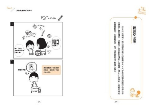 ※ 心理師連環漫畫:將老師與家長、孩子間的相處、摩擦、爆笑等生活鏡頭以漫畫方式貫穿全書。