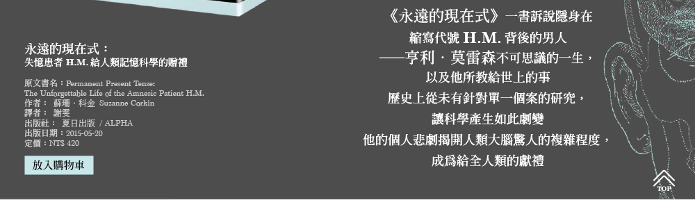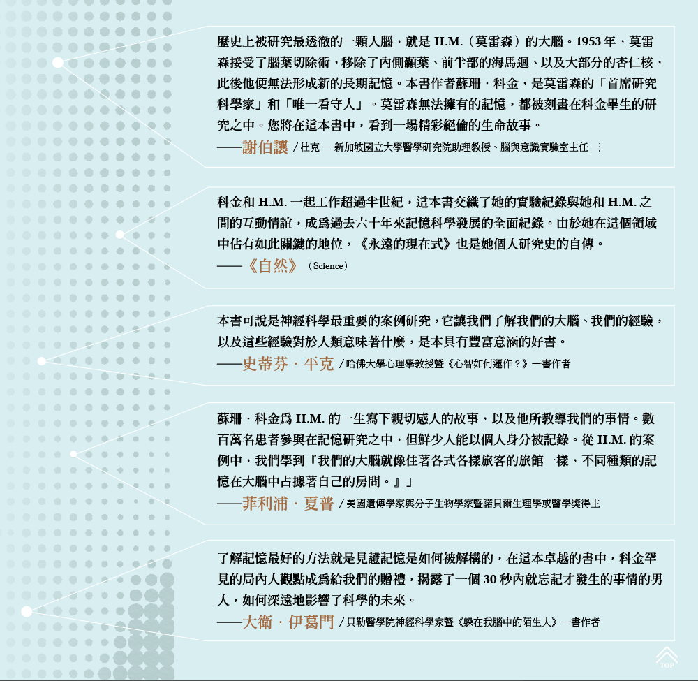 這本書是獻給亨利以及他這一生的禮物,同時也是對於記憶科學的探索。記憶是我們所做的每一件事的必要元素,但是我們卻無法有意識地知覺其範疇以及重要性。我們把記憶視為理所當然。在我們行走、談話、吃食時,我們並沒有注意到我們的行為根源於我們之前所學習並記憶的資訊和技能。我們持續仰賴我們的記憶,讓我們度過每天的每個時刻。我們需要記憶才能生存下去──沒有記憶,我們就不知道要如何幫自己穿衣服、在我們的街區晃盪,或是與其他人溝通。記憶讓我們能夠重訪我們的經驗、從過去中學習,甚至計畫未來要做什麼。記憶把每一刻,從早到晚,日復一日,年復一年,連結起來。
