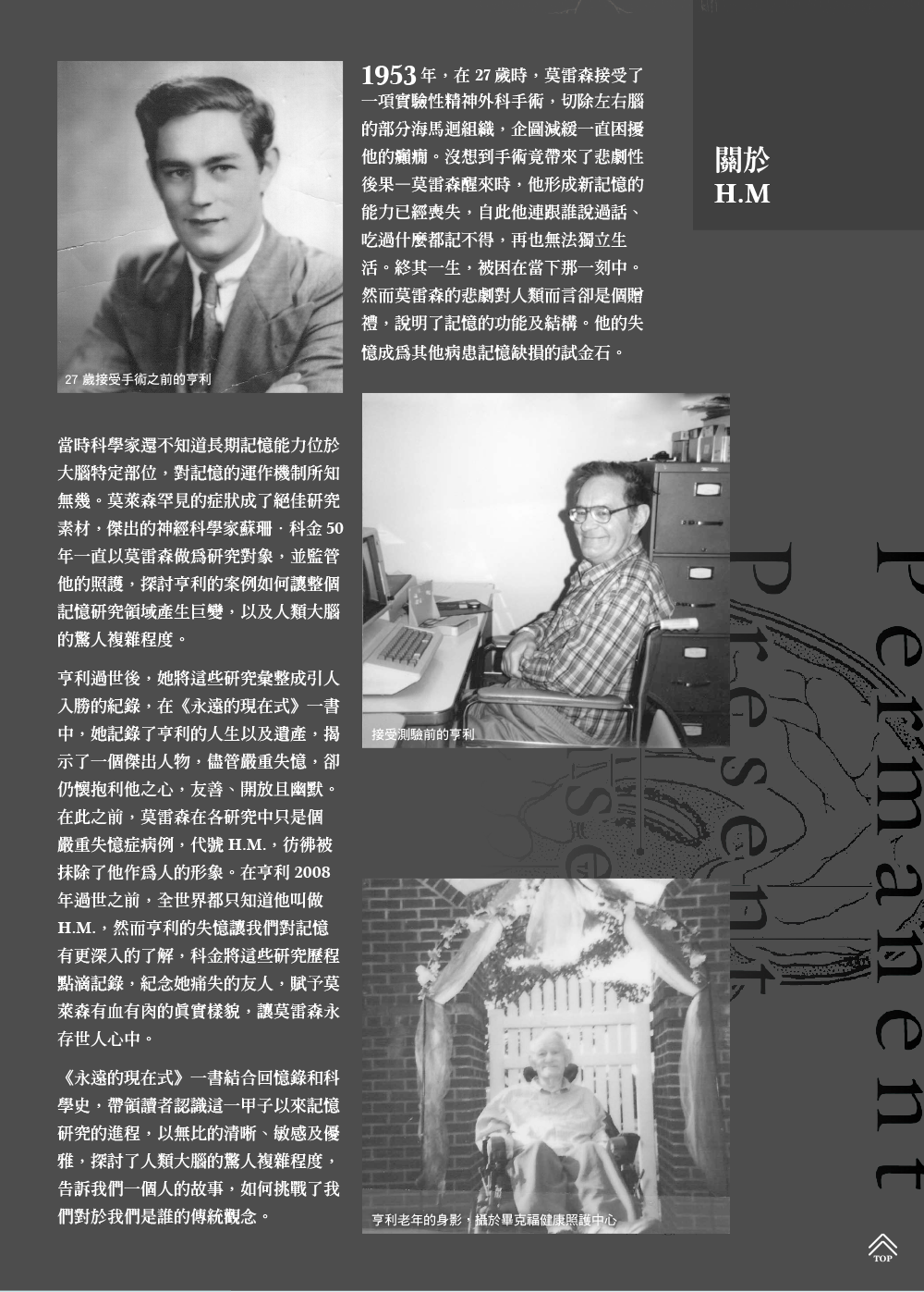 亨利接受手術時是位二十七歲的青年,現在他已經六十六歲了,平日行動需仰賴助行器以避免跌倒。然而對他而言,流逝的只不過是一小段時光而已;手術結束後的這幾十年來,他一直活在永遠的現在式裡:他再也記不得見過哪些人的面孔、造訪過哪些地方、或是經歷過哪些片刻。他的經驗在發生過後數秒,就會從他的意識中溜走;我與亨利的這番對話,也是轉瞬便在他腦海裡消失無蹤了。
